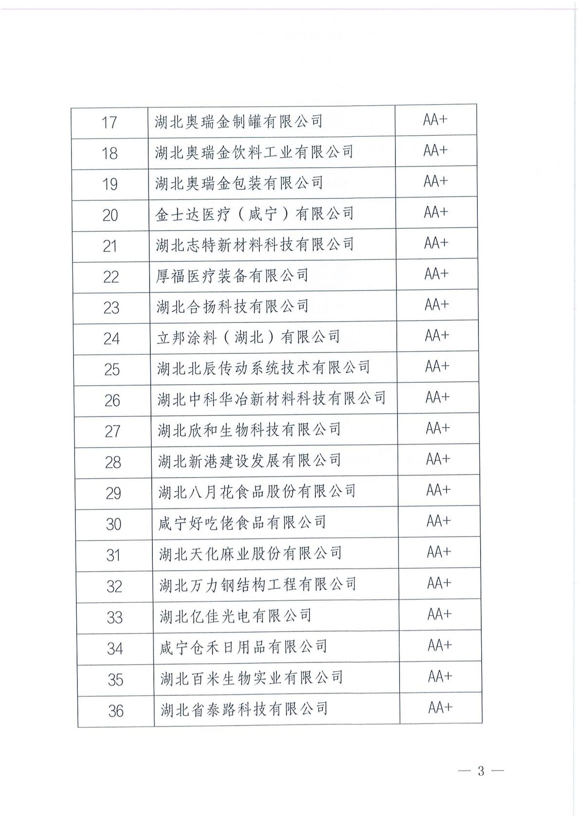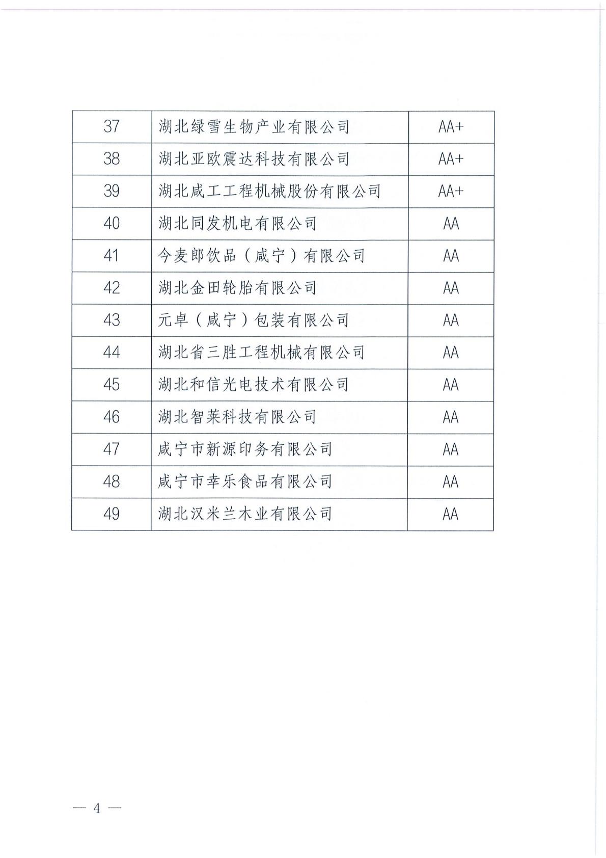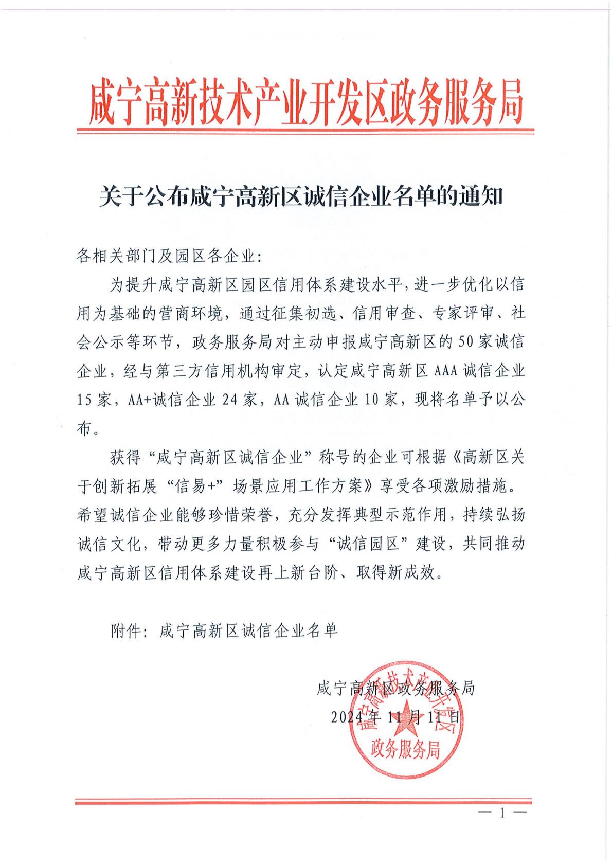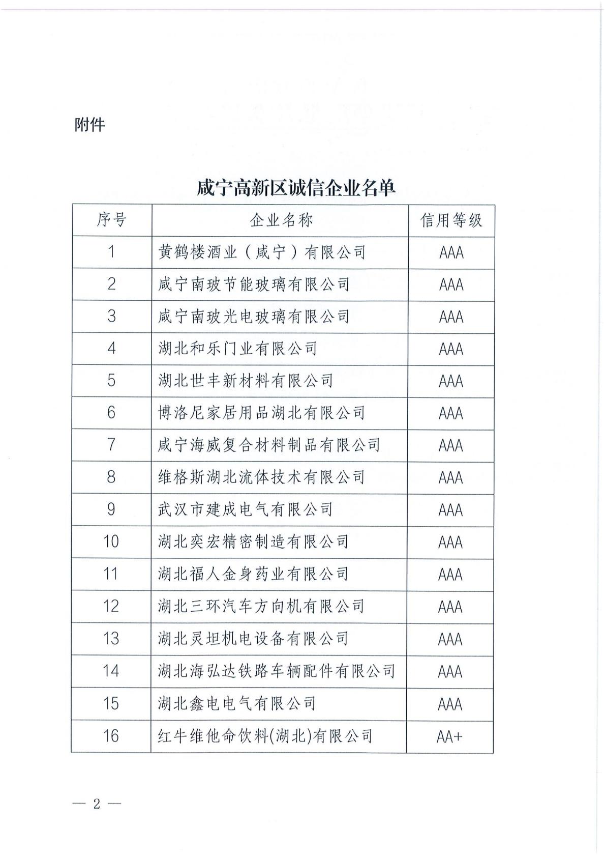 关于公布咸宁高新区诚信企业名单的通知